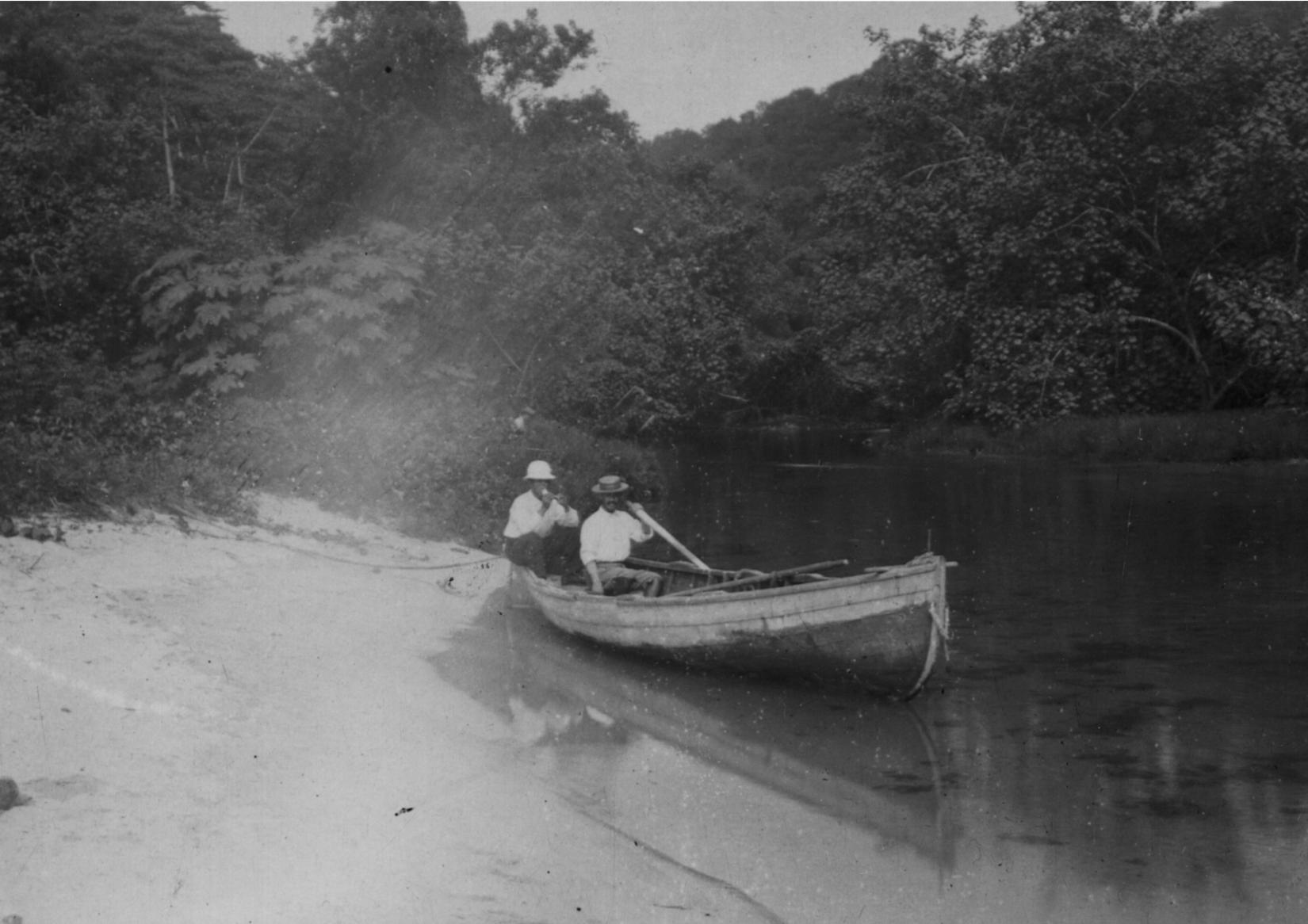 Cette image montre le Gouverneur août Gissler et deux de ses amis à l'heure de la tentative échouée de colonisation d'île de cocos.